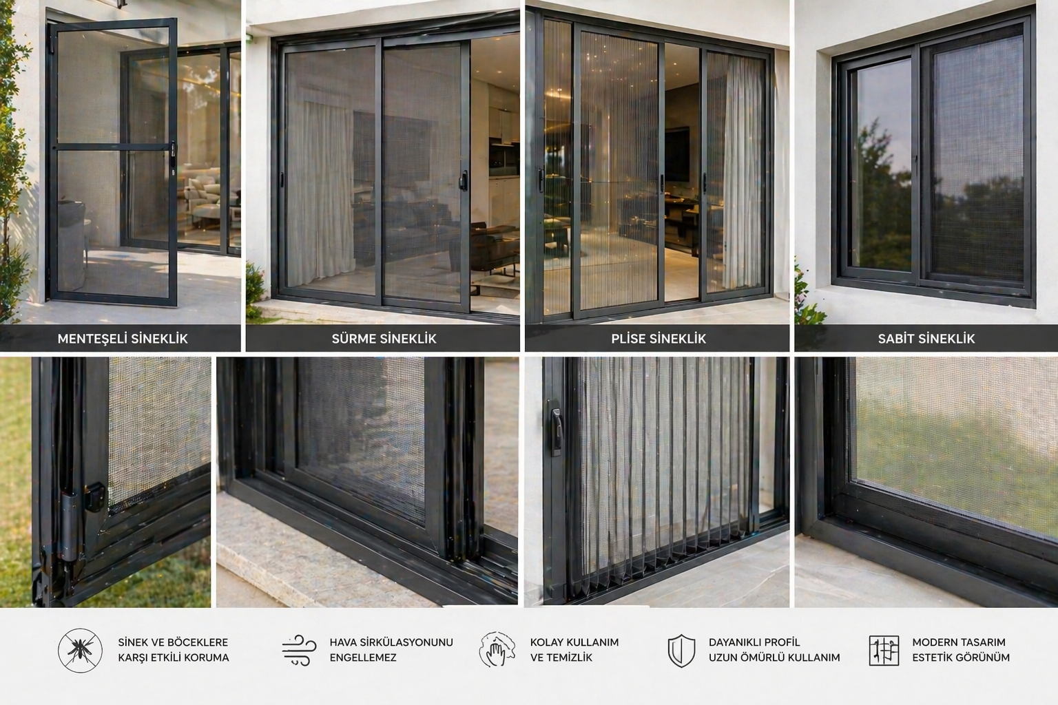 Pencere ve kapılara özel olarak tasarlanan sineklik sistemlerimiz; menteşeli, sürme, plise (pileli) ve sabit modeller gibi farklı seçenekler sunarak her ihtiyaca uygun çözümler sağlar. Dayanıklı alüminyum çerçeve ve kaliteli sineklik teli sayesinde uzun ömürlü kullanım imkanı sunar.